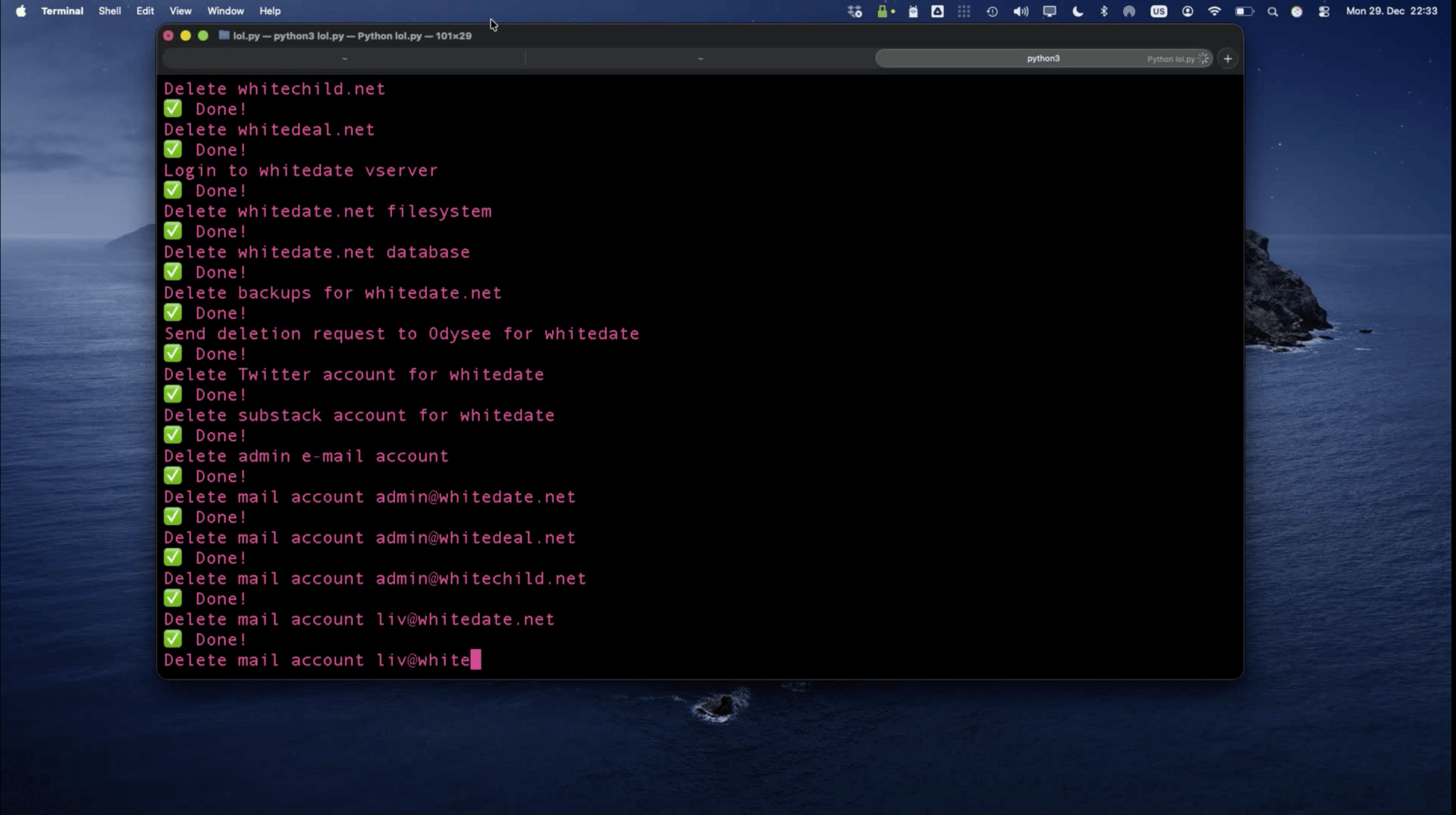 Al termine del suo intervento al Chaos Communication Congress, Root ha infine eseguito in diretta uno script che ha cancellato database e backup di WhiteDate, WhiteChild e WhiteDeal. L’azione è stata accolta con lunghi applausi dal pubblico di hacker. L’amministratrice dei siti, ha reagito definendo l’operazione “cyber-terrorismo” su X e minacciando azioni legali.